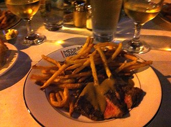 The waiter brings out the meat and fries (delicious, slightly salty, impossible to stop eating) in two stages. A small portion to get you started, coated in a “secret sauce.” About 10 minutes later the waiter returns with more steak and fries. Excellent.