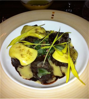 Believing that my arteries would not be sufficiently clogged by the mounds of cheese with the starter, for my main course chose the $28 hanger steak. It’s served with huge helpings of butternut squash ravioli, pancetta, pork and black pepper. The steak — cooked medium rare — was tender, and the port-based sauce giving each bite a rich, slightly sweet and delicious tang. Top marks too for the ravioli, overflowing with butternut squash.
